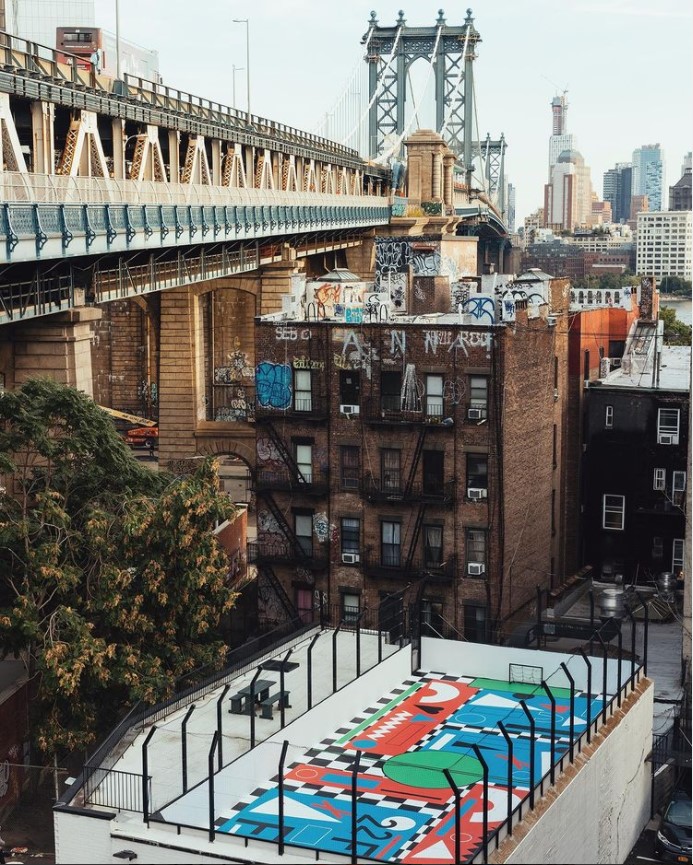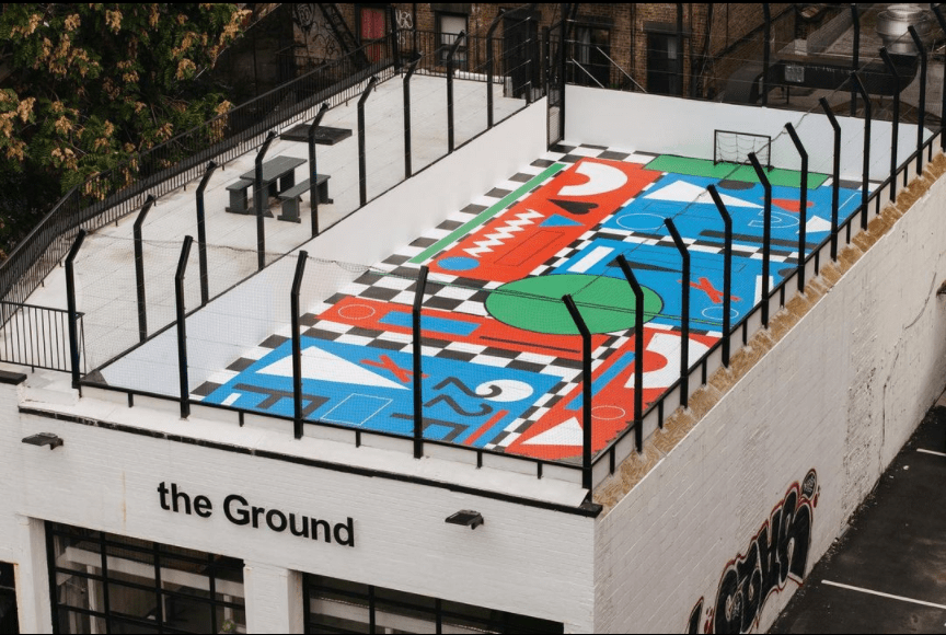 Recently, theGroundNYC had an amazing FIFA 22 design created for their rooftop pitch. This beautiful mural designed by Nina Chanel Abney was painted by Andrew Hurley, Doug Aldrich, and One Drop Sign Shop and has lit up the Chinatown area with its vibrancy.