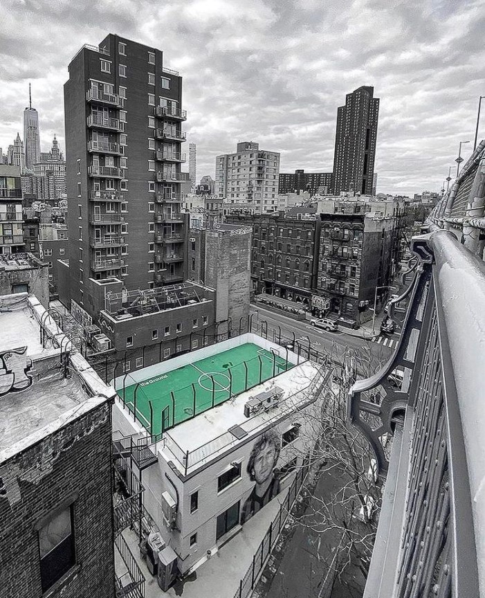 You can keep a lookout on Just Play Soccer NYC for a chance to play some pickup on this wavy rooftop!